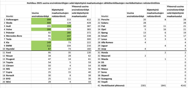 Kun merkkikohtaisesti lasketaan huhtikuun käytettyinä maahantuotujen rekisteröinnit sekä uusina ensirekisteröinnit, nousi ykkös sijalle sähköhenkilöautoista Volkswagen. Huomion arvoista on, että kymmenen eniten rekisteröidyn merkin joukosta neljää on rekisteröity käytettyinä enemmän kuin uusina.