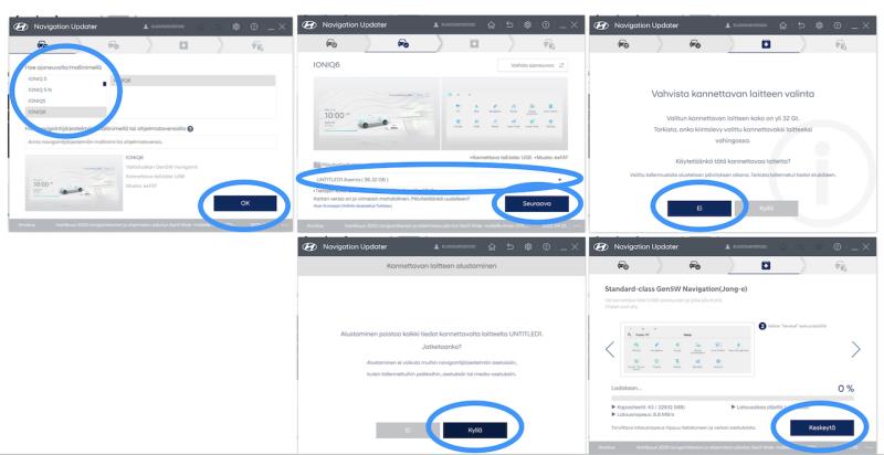 Hyundain suomalaisen maahantuonnin sivuson linkki ohjaa englanninkieliselle navigoinnin karttojen päivityssivustolle, josta ensin asennetaan asennusohjelma. Asennusohjelma asentuu erittäin nopeasti, kunhan käyttäjä on ensin vastannut muutamaan kysymykseen.