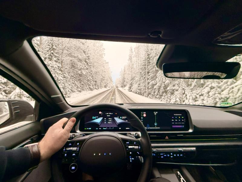 Hyundai Ioniq 6 on erinomainen talviauto, kuten on ollut lähes poikkeuksetta kaikki ajamani lukuisat muutkin sähköautot. Mukavaa tasaista lämmintä riittää matkustamoon. Ohjaus toimii Ioniq 6:ssa riittävän tunnokkaasti myös talviajossa, eivätkä pienet jäiset urat tee merkittävää haittaa ajamiseen. Pari auton avustinta kutienkin pitää heti kytkeä pois päältä. Talvellakin ylinopeusvaroitin lähtee aina ensimmäisenä pois päältä ja onneksi sen saa poistettua ratin nappia hetken pohjassa pitämällä. Ohjausavustin ei toimi mielestäni missään autossa lumipolanteisilla teillä, mutta onneksi Ioniqissa saa helposti kytkettyä adaptiivisen vakionopeussäätimen ilman ohjausavustinta. Sen sijaan EU:n määräämä kaistallapitoavustin menee päälle aina käynnistyksessä, vaikka sekään ei todellakaan missään autossa toimi toivotulla tavalla lumipolanteisilla teillä. Sen poistamiseksi joudun painamaan ensin ratin tähti-näppäimestä ja sitten vielä ajotietokoneen näytöltä kahta eri kohtaa. Kun kaistallapitovahdinkin on poistanut, on lumipolanteisella kapammallakin tiellä ajaminen nautinnollista.