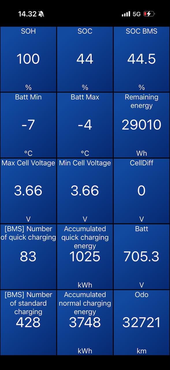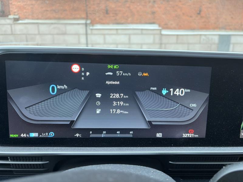 Hyundaikin käyttää auton esilämmittämiseen suurjänniteakuston energiaa, mutta koska auto oli lataukseen kytkettynä, alkaa lataaminen uudelleen, kun akku vajunee. Kuitenkin, koska kotilataukseni on pienitehoinen yksivaiheinen 8A, ei sen kautta saatu latausteho riitä kattamaan lämmityksen ottamaa tehoa, joten akku tyhjenee hieman esilämmityksen aikana. Niinpä akusto oli 97% varaustasossa kun testini alkoi. CarScanner juorusi, että ajoakustossa olisi sen mukaan käytettävissä liikkeelle lähtiessä 68,232 kWh. Norjalaisen tubettajan Björn Nylundin testistä olen nähnyt, että tuon lisäksi akustossa on auton näyttämän ja tuon tiedon nollatason jälkeen vielä noin 4 kWh. Auton mittaristossa oli lähtiessä mittarlukemana 32 492 km.