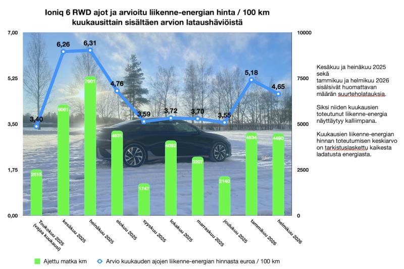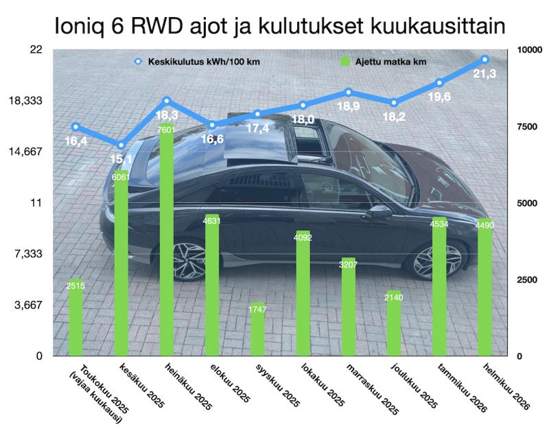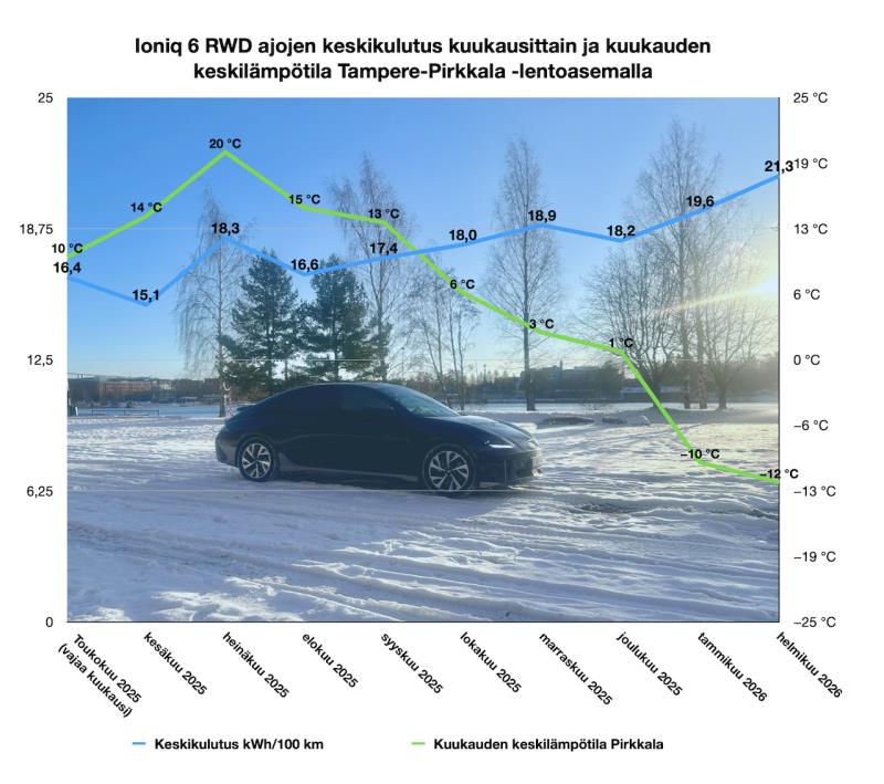 Takavetoisella Hyundai Ioniq 6 -sähköautollamme on nyt ajettu vajaat kymmenen kuukautta ja vähän reilut 41 000 kilometriä. Aika usein esitetty väittämä sosiaalisessa mediassa kuuluu: "Sähköauton kulutus tuplaantuu talvella ja sen myötä toimintamatka puolittuu." Pelkästä uteliaisuudesta päätin pitää kirjaa autoni kuukausittaisista kulutuksista ja liikenne-energian kuluista. Samalla selviää itsellekin, kuinka lähellä tuo yleinen väittämä on todenpäeräisyyttä omassa sähköauton arjen käytössä.