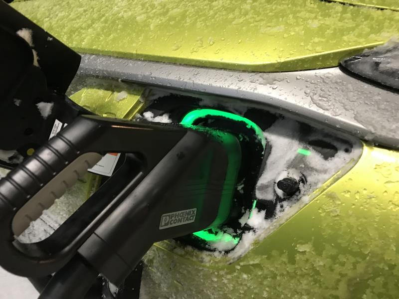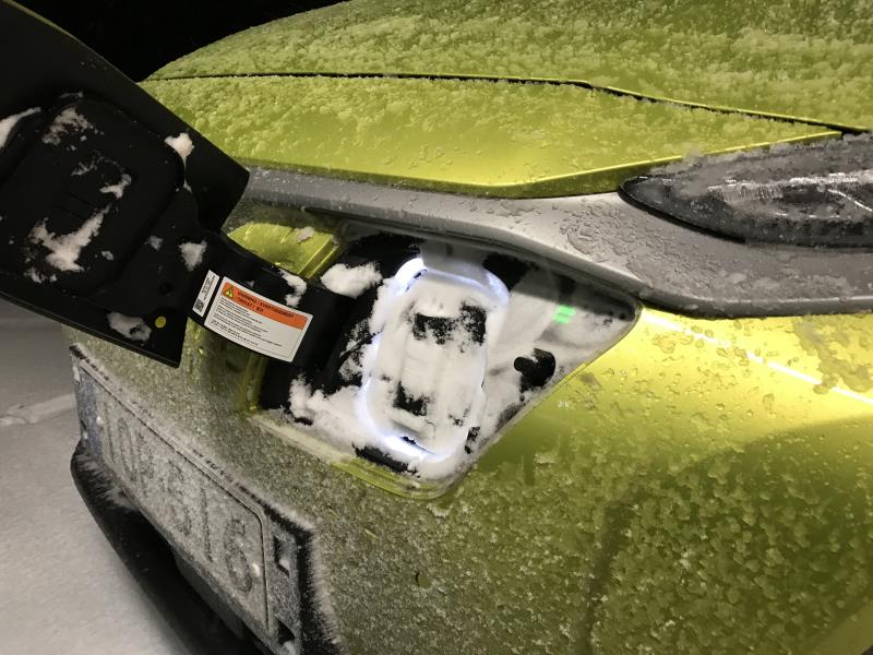 Kerta toisensa jälkeen kaavin lisää lunta pois latausliittimen syövereistä, kunnes useiden yritysten jälkeen lataus viimein käynnistyi. Kaikki siis olisi ollut lopulta hyvin, vaikka latausta olisin tarvinnutkin, jota siis en tällä kertaa edes tarvinnut.
