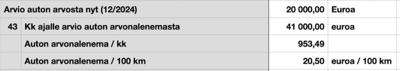 Auton arvonalenema on uutena auton ostaneelle luonnollisesti ylivoimaisesti suurin kuluerä. Olen arvottanut auton jäljellä olevaa arvoa melko säännöllisesti autojen myyntikanavia seuraamalla. Olen pitänyt linjaa, että otan vastaavan auton paljon ajetuista pyyntihinnoista noin 10 - 15 % pois ja arvotan sillä auton jäljellä olevaa arvoa. Nyt tilanne on sellainen, että tästä eteenpäin auton arvonalenema kuukautta sekä ajettua kilometriä kohden lähtee laskemaan, koska suurin arvon alennus on jo tapahtunut. Tällä hetkellä arvioni auton arvonalemasta on 20,50 euroa / 100 km.