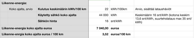 Liikenne-energia sähköautoilussa on useimmiten edullista, etenkin jos on mahdollisuus kotilataukseen. Lasken meidän ID.4:n liikenne-enegia kulut 200 000 km ajolle keskikulutuksella 22 kWh/100 km sisältäen lataushäviöt olevan 3,52 euroa / 100 km.