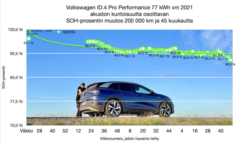 Lasken, että tämän ID.4:n akuston SOH-lukema on 200 000 kilometriä ajettuna noin 90 %. Olen päätynyt tuohon noin 90 % SOH-lukemaan tarkkailemalla OBD Eleven sovelluksella auton akuston suurinta käytettävissä olevaa kapasiteettia, minkä näen Wh-lukemana. Se on pudonnut nyt hieman alle 70 000 Wh:n tasolle. Vertaan tuota kulloistakin Wh-lukemaa uudelle autolle ilmoitettuun 77 000 Wh:n kapasiteettiin. Mittaustapani ei ole absotuuttisen tarkka, mutta antaa riittävän oikean kuvan ja laskemani akuston SOH-lukeman trendi on oikeastaan itselle olennaisempi. Juuri ennen 200 000 kilometrin matkamittarilukemaan akuston SOH-lukema teki poikkeavan nopeamman pudotuksen. Nämä nopeammat pudotukset ajoittain auton SOH-lukemassa ovat itselle tuttuja jo aiemmista sähköautoista.