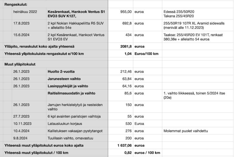 HUOM! tein kululaskelmaan tarkennuksen 20.2.2025, kun sain akkutestin sivutuotteena tietooni koko auton elinkaaren aikana ladatun sähkön määrän sekä AC- ja DC-latausten suhteen. Katso tarkennetut lukemat tästä blogikirjoituksestani.