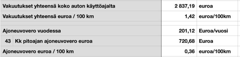 Vakuutukset ja ajoneuvoverot ovat tehneet yhteensä 1,78 euroa / 100 km tasoisen kulun autoiluun. Autossa on vielä toistaiseksi ollut Superkasko, mutta nyt jäljellä olevan arvon laskettua matalalle tasolle, harkitsen jo se pois jättämistä ja oman riskitason kasvattamista. Vakuutuksen hinta on auton omistamisen aikana myös hieman noussut pariin otteeseen. Ajoneuvovero on näin vanhalla sähköautolla vielä uusimpia matalampi, koska vuonna 2021 uusista sähköautoista maksettiin vielä hieman autoveroa. Myöhemmin autovero muuttui nollaan sähköautoilla ja samalla vuosittain maksettavan ajoneuvoveron perusveron osuus nousi sähköautoilla.