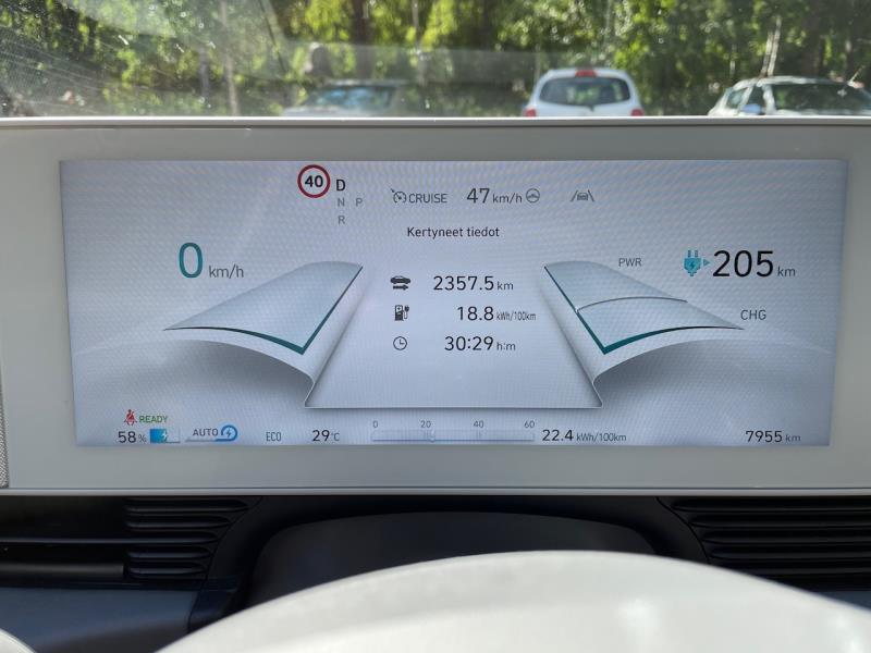 Olen ajellut vuosien saatossa useita kertoja Hyundain ja Kian sähköautoilla ja niiden kokemusten perusteella auton ajotietokoneen ja mittariston käyttö oli jo ennestään niin sujuvaa, etten oikeastaan kiinnittänyt asiaan mitään huomioita. Auton antamat toimintamatka-arviot pitävät Hyundaissa hyvin paikkaansa, vaikka se ei osaakaan joidenkin muiden tavoin antaa arviota navigaattoriin asetetun reitin perusteella. Navigaattorin kanssa tulee toimeen, vaikka voisi se olla sujuvampikin käytöltään.