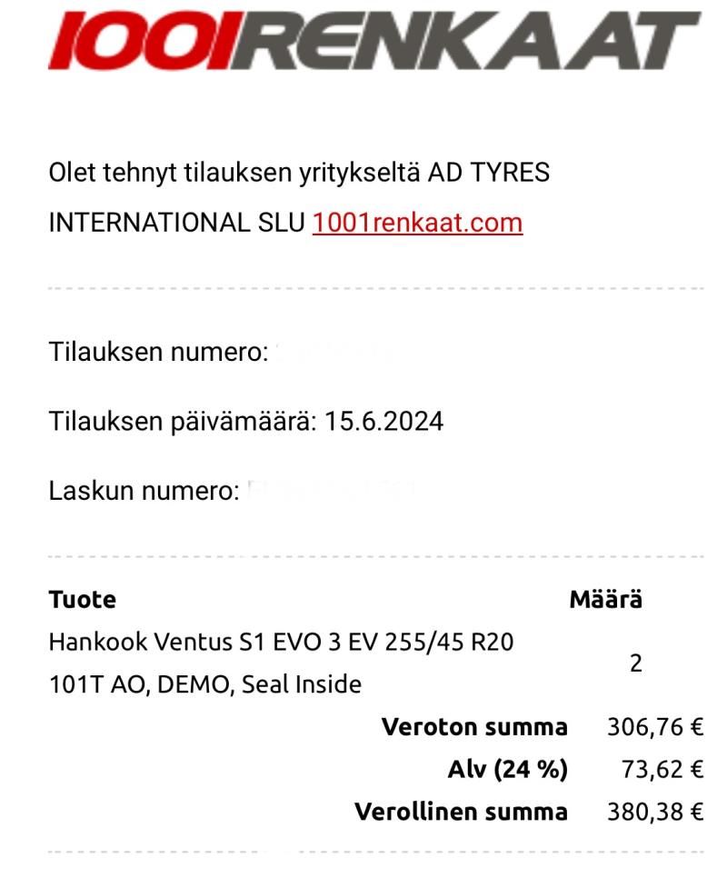 Tilasin uudet kumit taakse samaisesta yrityksestä, mistä olin tilannut edellisetkin Hankookit. Nyt vain en löytänyt enää aivan samoilla merkinnöillä olevia kumeja. Tarkemmin kirjoitettuna uudet kumit ovat: Hankook Ventus S1 EVO 3 EV 255/45 R20 101T AO, DEMO, Seal Inside