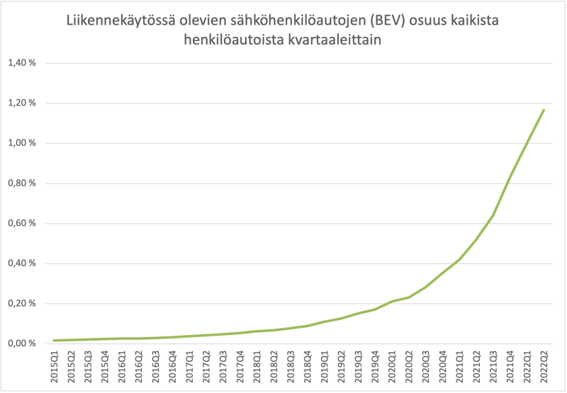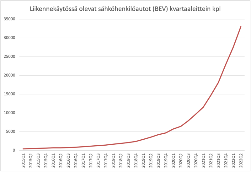 Q2/2022 lopussa Suomessa oli tieliikennekäytössä 32 981 sähköhenkilöautoa (BEV). Lukema on noussut Q1 lopusta 5 422 kpl ja vuoden takaisesta 18 299 kpl, eli sähköautojen määrä on nousut peräti 125 % vuoden takaisesta tilanteesta. Nousukäyrä on tyypillinen jääkiekkomailan lapa, joka osoittaa vahvasti ylöspäin.