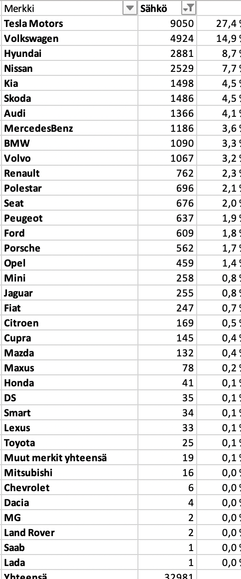 Tesla on yleisin sähköautomerkki Suomessa 9050 kpl ja 27,4% osuudella. Valmistajakonserneista Volkswagen Group on yleisin 9159 kappaleella, kolmanneksi yleisin konserni Teslan jälkeen on Hyundai/Kia 4379 kappaleella. Sähköautojen merkkikohtaisessa tilastossa on useita kiinnostavan merkkisiä sähköautoja.