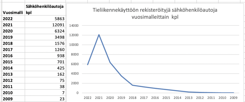 Tieliikennekäytössä olevat sähköhenkilöautot painottuvat vahvasti uusiin vuosimalleihin ja vuoden 2021 autoja onkin selkeästi eniten, 12 091 kpl, eli peräti 37 % kaikista sähköhenkilöautoista (BEV). Tämä kuvaaja osoittaa myös miksi edulisempia sähköautoja ei ole kovin nopeasti tulossa runsain määrin käyttettyjen markkinoille.