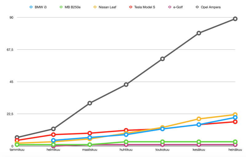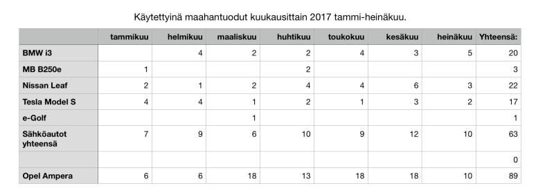 Sähköautoja tuodaan edelleen kovin vähäisiä määriä käytettyinä maahan. Selkeästi runsaampaa on ollut lähimpänä sähköautoa olevan "epäsähköauto" Opel Amperan käytettynä maahantuonti. Sitä on tuotu tammi-heinäkuussa 2017 maahan käytettyinä 89 kappaletta, joka on enemmän kuin kaikki maahantuodut BEV-autot yhteensä. Opel Amperaa ei tule sotkea juuri markkinoille tulleeseen Opel Ampera-e:hen, joka taasen on täyssähköauto ja niiden toimitukset Eurooppaankaan eivät ole vielä alkaneet siinä määrin, että niitä olisi voitu tuodakaan käytettyinä.