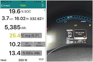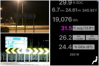 Akussa oli vielä 6,7 kWh sähköenergiaa jäljellä. Se olisi riittänyt vielä noin 35 km matkaan kohti pohjoista, eli hiukan Pihtiputaan ohi.
