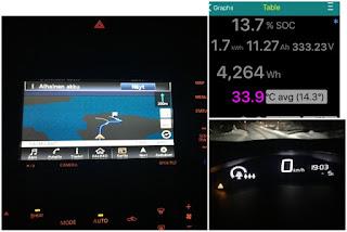 Jyväskylän pikalatauksen aikana akut lämpenivät jo sen verran että max lämpö oli 45,1 C ja min 33,8 C. Auton mittariston mukaan kuitenkaan punarajaa ei vielä hätyytelty.