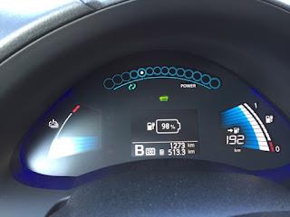 Matkan alussa auton matkamittariin on kertynyt 1273 km, ja mittaristo näyttää 192 km toimintamatkaa 98% latauksella! No, me kokeneet Leaf-kuskit osaamme päätellä tuosta todennäköisen maantieajon rangen.