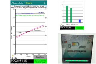 Hieman yli 15 minuutin lataustauon aikana ehdin saada 10,78 kWh lisää sähköä. Latausteho säilyi koko tämän latauksen ajan erinomaisella yli 46 kW-tasolla. Ajokki oli jo lähtiessä lämmennyt edellisestä pikalatauksesta ja pyytämästäni Type2-viimeistelystä. Tämän lyhyen latauksen aikana akun lämpö nousi (max) 21,7 asteesta noin viidellä asteella päätyen noin 27C.