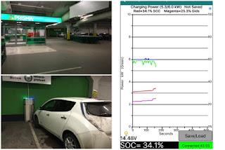 Prismalle saapuessani akussa oli noin 4,8 kWh jäljellä, eli lisää tarvitaan noin 8,4 kWh. Tämä tarkoitti noin 1,5 tunnin latausta.