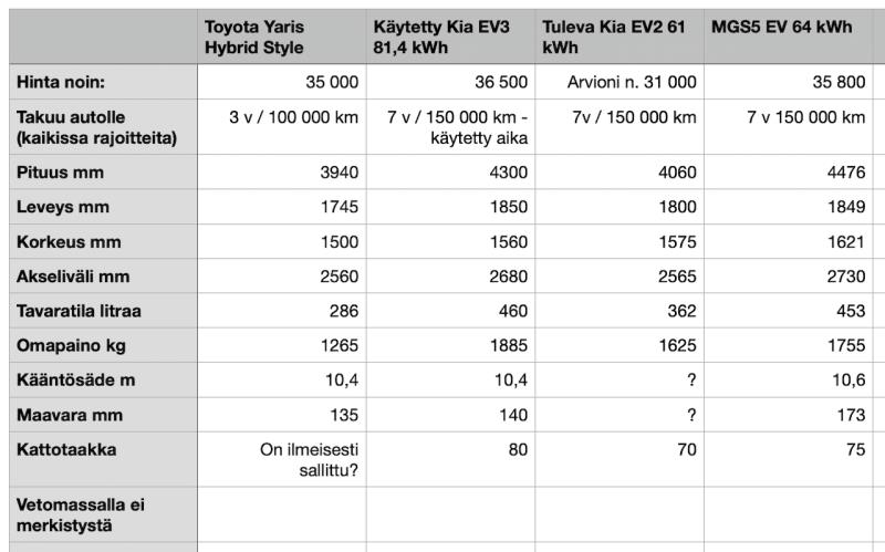 Laitoin siis taulukossa vertailuun Yaris Hybrid Style, Kia EV3 käytettynä ja Kia EV2 uutena sekä MGS5 EV:n. Varmasti muitakin vaihtoehtoja olisi, mutta näillä voin jatkaa keskustelua henkilön kanssa.