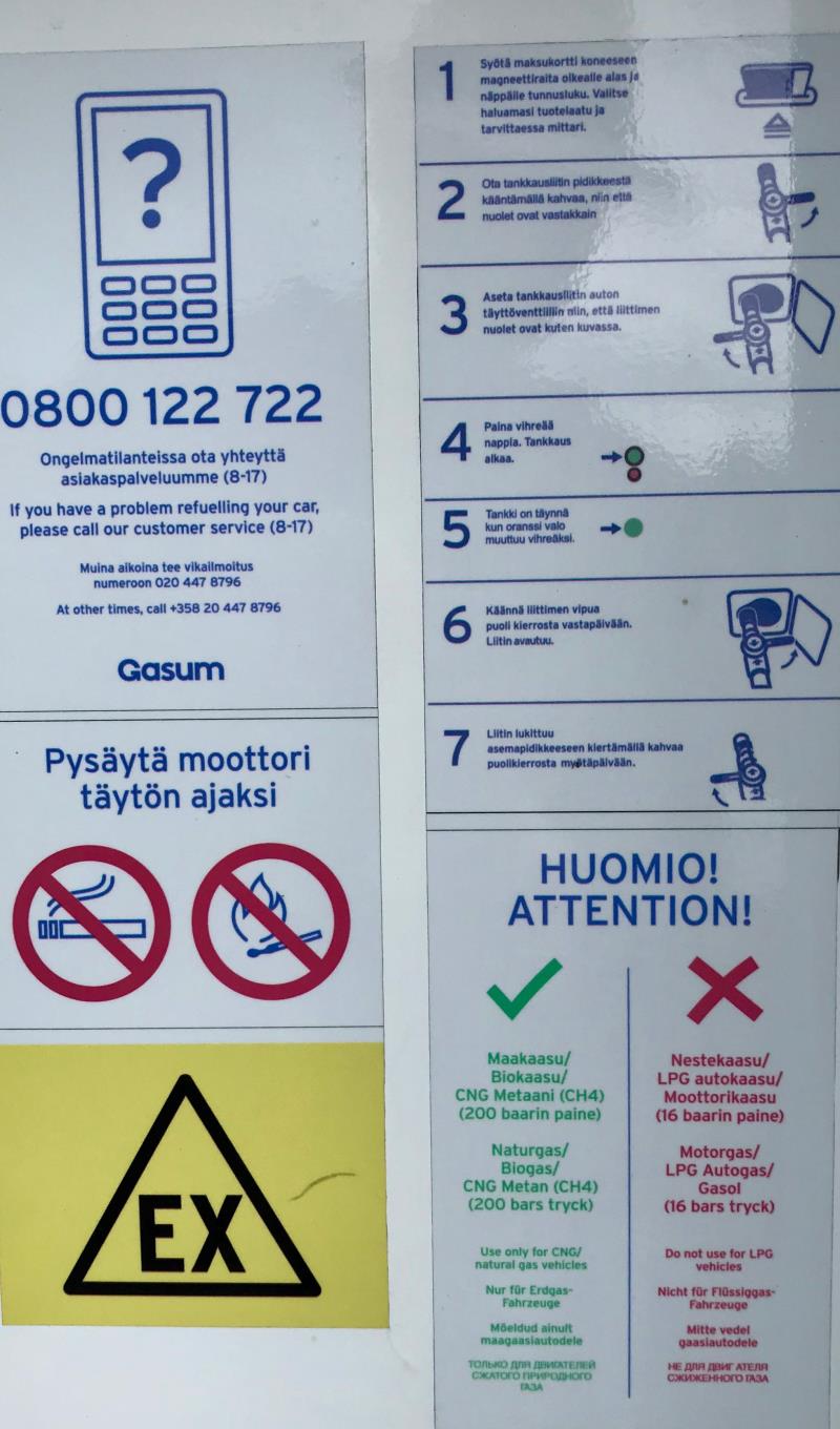 Ensimmäinen kaasuntankkaukseni muistutti kieltämättä ensimmäistä sähkön pikalataustani. Tuli melkoisen tyhmä olo, kun en osaa toimia intuitiolla oikein. Onneksi tolpasta löytyi pienellä etsinnällä ihan ok ohjeistus. Mutta jo ohjeiden kohdassa 2 tuli ongelma vastaan. Kaasuletku ei lähdekään ohjeen mukaan lepuutuspaikastaan kahvaa kääntämällä. Aikani temusin mokoman letkun kanssa ja olin jo luovuttamassa, mutta sitten sain läsnäolijoilta ohjeen vetää liikkuvat letkun päästä samalla taaksepäin. Vihdoin letku irtosi. Autoon kytkeminen sentään oli ohjeen mukaan helppoa, kuten maksaminen ihan normaalilla pankkikortilla sekä kaasun laadun valinta.