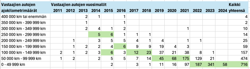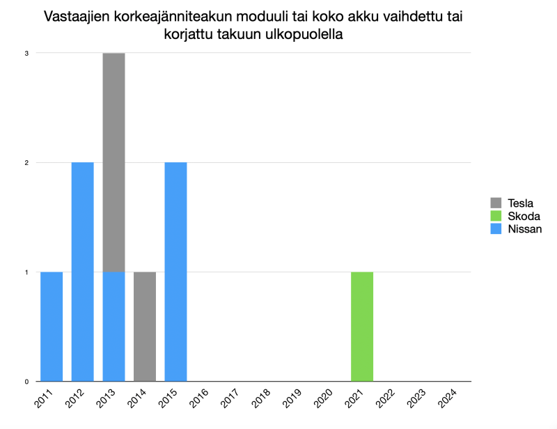 Yhtä poikkeusta lukuunottamatta kaikki vikaantumisten takia takuun ja takaisinkutsukampanjoiden ulkopuolella korjatut tai vaihdetut korkeajänniteakustot ovat olleet vuosimallia 2015 tai sitä vanhemmissa vastaajien autoissa. Tätä selittää edelleen ennen kaikkea sähköautojen nuori ikä ja pääosin 8 vuoden / 160 000 km takuu.