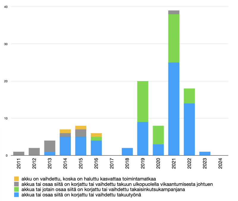 Akkuja on korjattu tai vaihdettu ainakin osittain takuutyönä tai takaisinkutsukampanjoissa