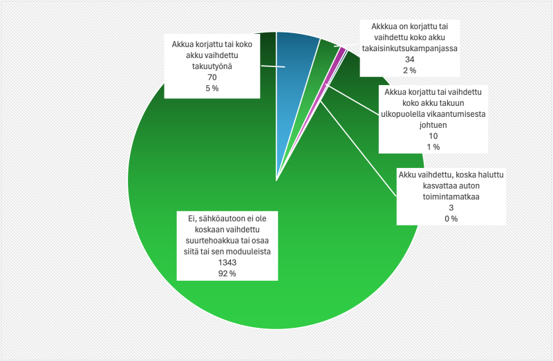 92 % vastaajien sähköautoista korkeajänniteakkua tai osaa siitä ei ole koskaan vaihdettu tai korjattu. Seitsemään prosenttiin vastaajien autoista on akkua tai osaa siitä tai sen tekniikasta korjattu joko takuutyönä tai takaisinkutsukampanjana. Jälkimmäisistä osa on saattanut jo olla takuunsa päättäneitä autoja, joihin on tehty akuston korjaustoimia valmistajan toimesta ja kustannuksela. Vain 0,7 % vastaajien sähköautoista on korjattu tai vaihdetu korkeajänniteakusto tai osa siitä takuun ulkopuolella. Lukemaa selittää merkittävissä osin sähköautokannan nuori ikä ja alhaiset kilometrimäärät.