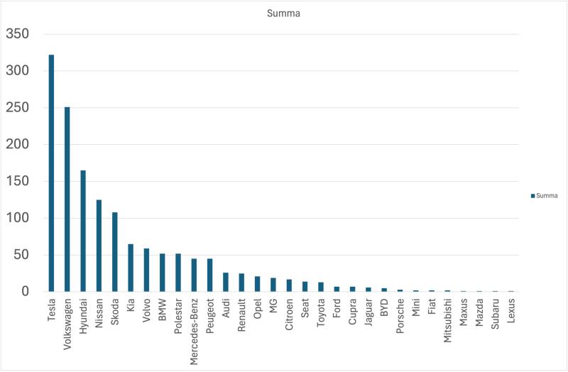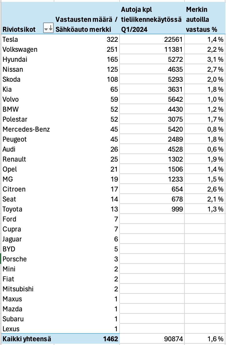 13.6.2024 aamulla kyselyyn oli tullut 1462 vastausta, mikä on 1,6 % Q1/2024 lopussa Suomessa tieliikennekäyttössa rekisteröityinä olevien sähköautojen määrästä. Vastaajien automerkkijakauma noudattaa pitkälti tieliikennekäytössä olevien autojen jakaumaa. Vastaajien automäärien hajonnasta näkee, että pienimpien vastausmäärien saaneiden merkkien osalta ei pidä tehdä mitään johtopäätöksiä kyselyn tuloksista.