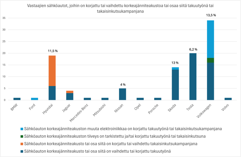 Volkswagenin ja Skodan akkuja näyttää korjatun tai vaihdetun takuuseen tai takaisinkutsukampanjoissa lukumääräisesti eniten, kuten myös suhteessa vastaajien automerkkien jakaumaan. (kaaviossa alla prosentit viiden merkin palkin yläpuolella: korkeajänniteakkujen vaihtojen tai korjausten suhteellinen osuus ko automerkin määrästä vastauksissa)