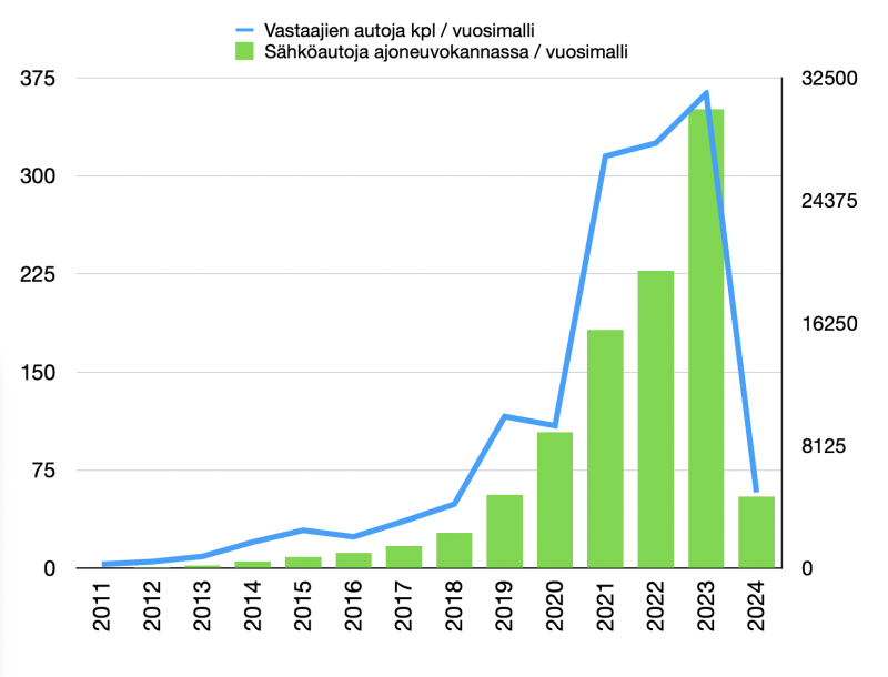 Vastaajien sähköauotojen vuosimallien hajonta vastaa melko lähelle tieliikennekäytössä olevien sähköautojen vuosimallihajontaa. Kuten kuvaajasta näkyy, on etenkin vuosimallia 2018 vanhempia sähköautoja häviävän pieniä määriä.
