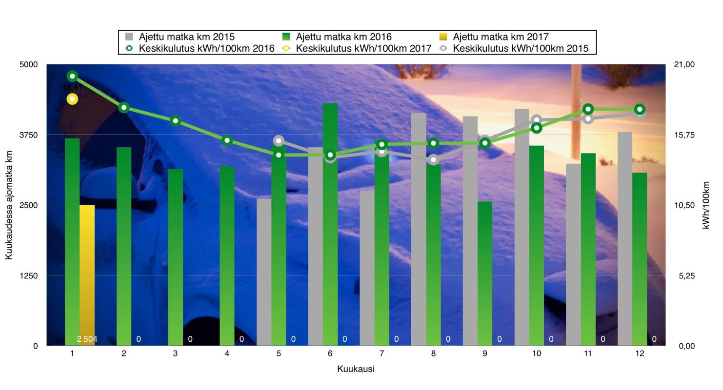 Tämän vuoden tammikuun keskikulutus oli 18,41 kWh/100km, kun se edellisvuoden tammikuussa oli 20,11. Tämä asettuu myös hyvin linjaan 2016 joulukuun keskikulutuksen sekä lämpötilan suhteen.