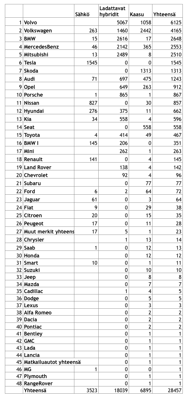 Merkkikohtaisen top20-lisan viisi kärkisijaa menevät Volvolle, BMW:lle, Mitsubishille, MB:lle sekä VW:lle lähinnä näiden lataushybridien määrästä johtuen. Tesla on 6. sijalla pelkästään sähköautoihin keskittyvänä valmistajana ja Nissan kahdeksantena myös pelkillä sähköautoillaan. Tesla onkin yleisin täyssähköauto Suomessa.