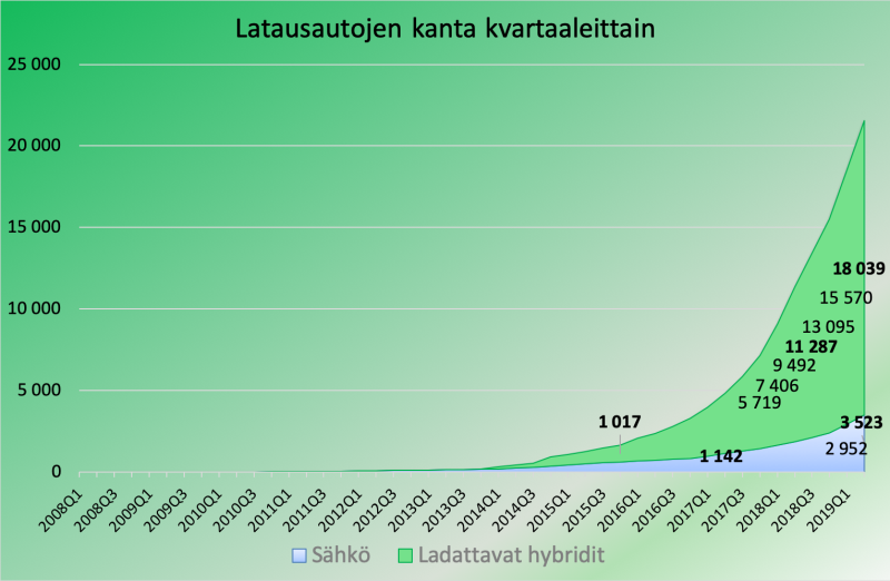 Lataushybridi- ja täyssähköhenkilöautoja on ajoneuvokantaamme rekisteröitynä jo 21 562 kappaletta, joka on 0,78 % kaikista liikennekäyttöön rekisteröidyistä henkilöautoista. Vaikka osuus kaikista autoista on edellen häviävän pieni, niin kasvaa osuus erittäin nopeasti.