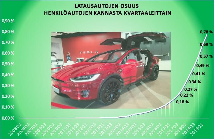 On helppo ennustaa, että latausautojen määrä kannassamme jatkaa räjähdysmäistä kasvamistaan. Sähköautojen tarjonta kasvaa ja etenkin Teslan Model kolmosta ja Nissanin Leafia on hyvin saatavilla. Lataushybridien runsas käytettyinä tuonti jatkuu varmuudella ja kun valmistajat saavat uudelleen tarjolle WLTP-päästöuudistuksen jäljiltä lataushybrideitä, niin niidenkin uusina rekisteröinnit tulevat lisääntymään. On myös uskottavaa, että etenkin Teslan sähköautojen käytettyinä tuonti tulee kiihtymään etenkin kun Model kolmosia alkaa saada Euroopasta käytettyinä.