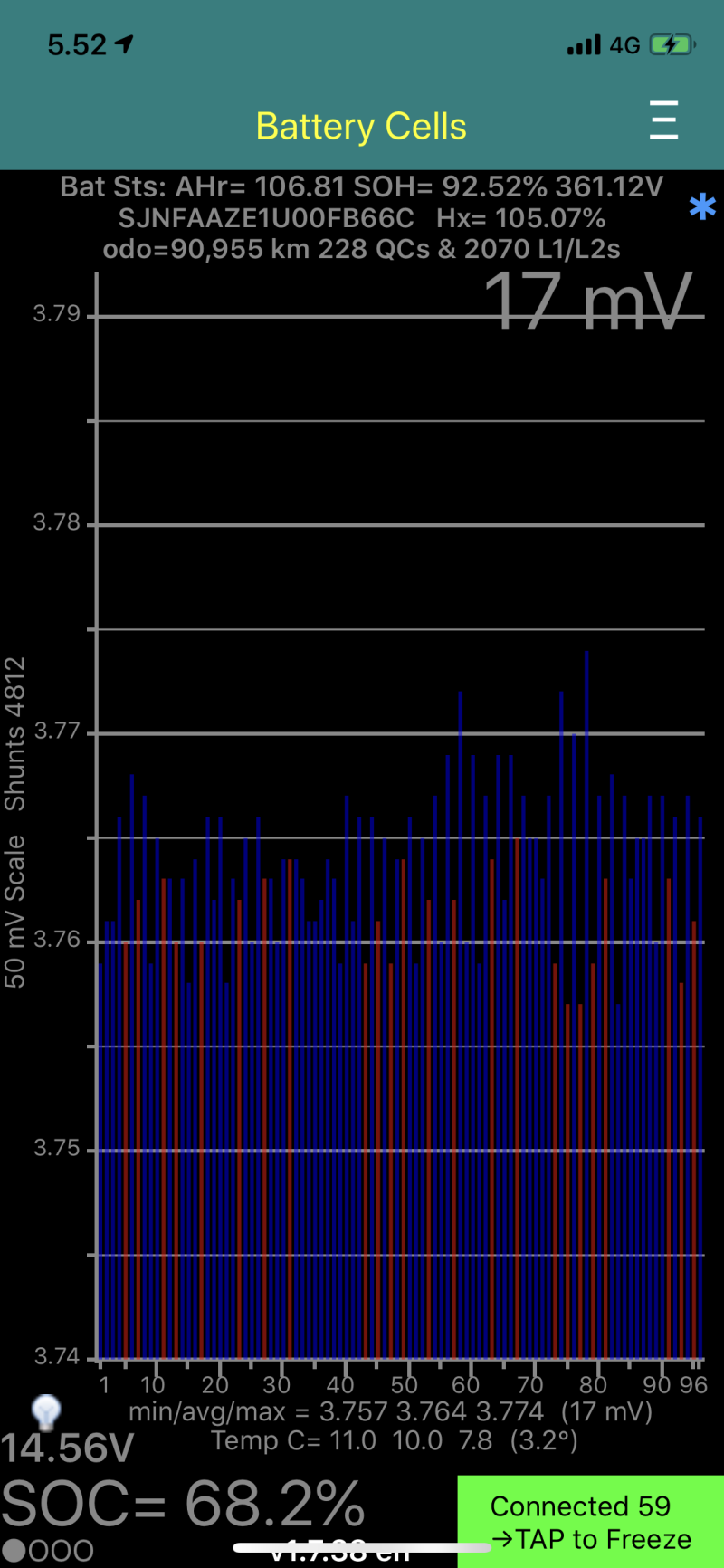 Täydennystä edelliseen pienen selvittelyn jälkeen. Hx kertoo akun sisäisen vastuksen (resistanssin) käänteisarvon (konduktanssin eli johtavuuden) suhteellisen tason. Kertoo omalta osaltaan akun kemian terveydestä, heikkenevän akun sisäinen vastus ja häviöt kasvavat ja siis konduktanssi laskee.