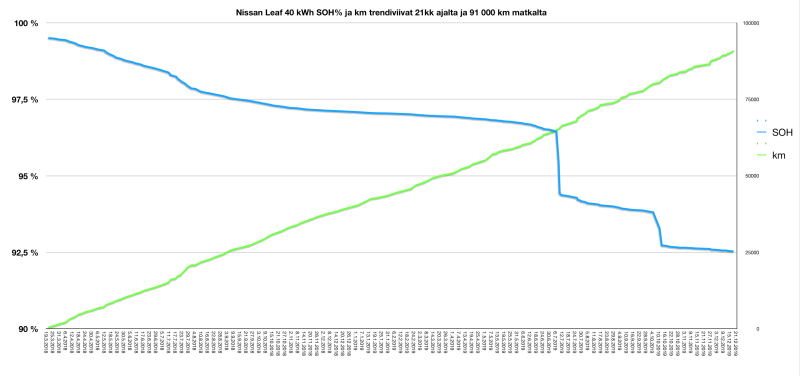 Tuossa 40 kWh Leafissa ainakin oman autoyksilöni perusteella näyttäisi akku kuluvan merkittävästi tuota 2,3% vuodessa nopeammin. Nyt kun autolla on ajettu 91 000 kilometriä 21 ajokuukauden aikana, on akun kuntoisuutta osoittava SOH-lukema (State Of Health) 92,52 % tasolla.