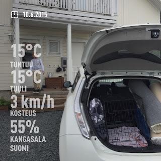 Matkustajina on minun lisäksi kaksi lapsistamme ja kaksi pientä villakoiraamme. Matkatavaraa on kahden yöpymisen verran. Peräkontissa on myös pari kappaletta mattoja mukana, niin saan kesän mattopyykit aloitettua.