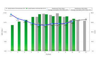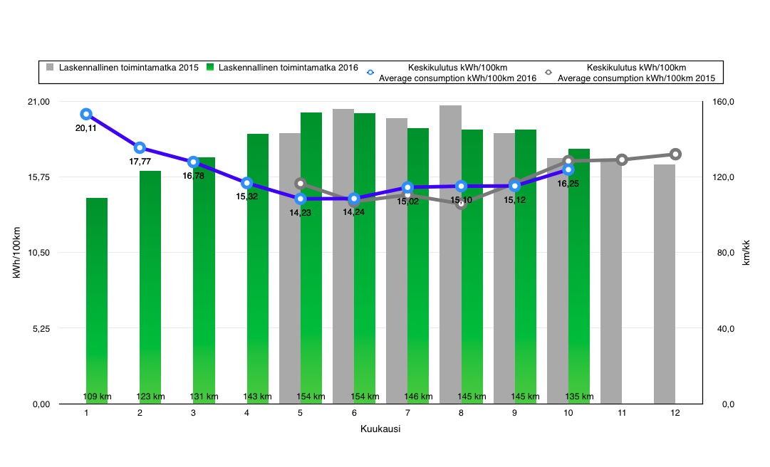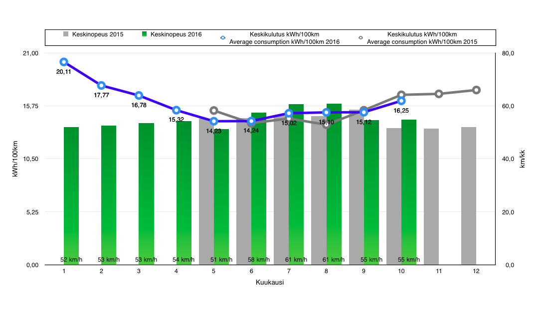 Nyt syksyllä kulutus on jälleen kääntynyt nousuun. Lokakuussa 2016 koko kuukauden keskikulutus oli 16,25 kWh/100km, joka on hieman viime vuoden lokakuuta pienempi.