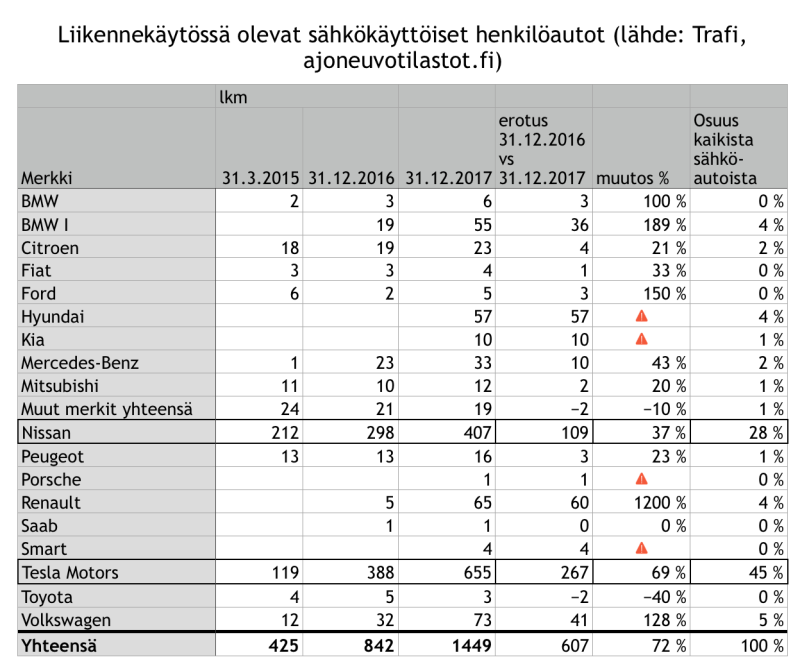 Uusia sähköautoja ensirekisteröitiin vastaavasti tilastoidussa Trafin tilastossa vuonna 2017 yhteensä 502 kappaletta. Näiden lisäksi käytettyinä yksittäin maahantuotuja rekisteröitiin Trafin tilaston mukaan vuonna 158 kappaletta. Yhteensä nämä tekisivät peräti 660 kappaletta joka on peräti 53 kpl enemmän, kuin rekisterissä olevien määrä kasvoi.