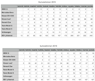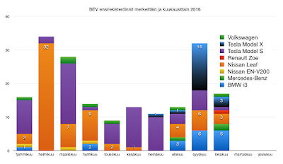 Lokakuussa 2016 rekisteröitiin eniten BMW i3-sähköautoja. Niitä rekisteröitiin kuusi kappaletta, joista kolme oli REX-mallisia.. Teslan rekisteröinneissä oli vuonna 2015 myös hiljaista, kuten tänäkin vuonna.
