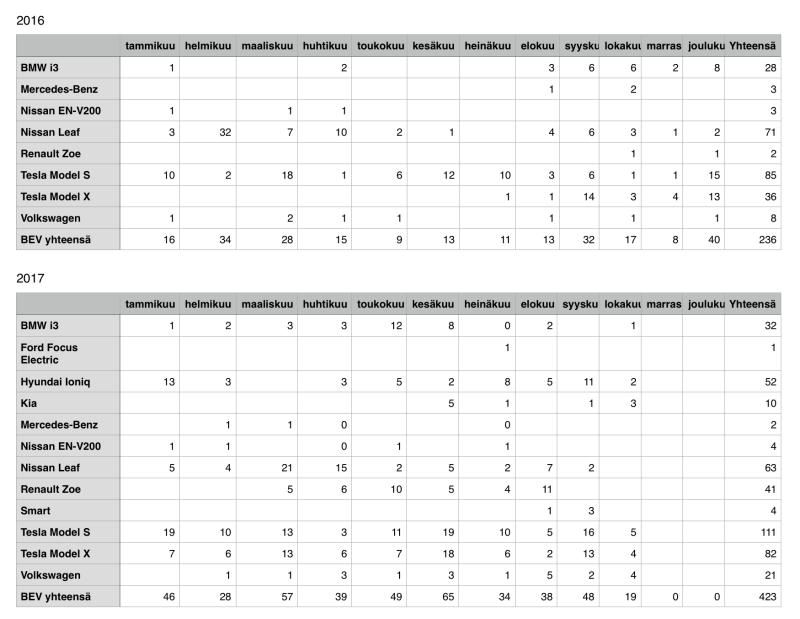 Tietojen lähteet: www.trafi.fi/tietopalvelut/.../sahkokayttoiset_autot sekä BMW i3 määrä www.trafi.fi/tietopalvelut/.../ensirekisterointien_merkki-_ja_mallitilastot koska BMW:n REX-mallit eivät rekisteröidy Trafin tilastoissa sähköautoiksi.
