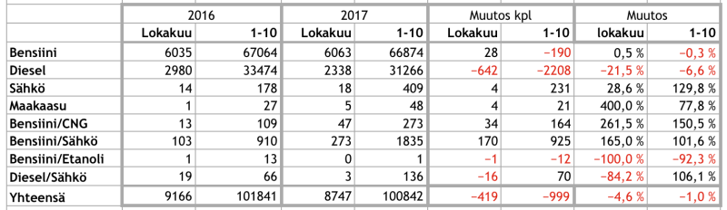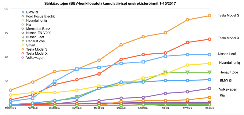 Lokakuussa 2017 uusien sähköautojen ensirekisteröinneissä niukkuutta