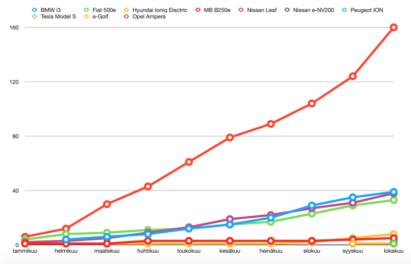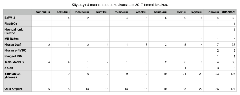 Käytettyinä maahan tuotujen sähköutojen verotuspäätöksia oli lokakuulle 2017 kirjattu 23 kpl, joka on jopa enemmän kuin uusien rekisteröintiejä oli lokakuussa. Näiden sähköautojen lisäksi Amperoita rekisteröitiin lokakuussa peräti 36 kappaletta. lähde: https://www.vero.fi/.../taulukoita_ajoneuvojen_sovelletuista_ve/