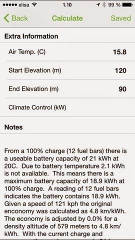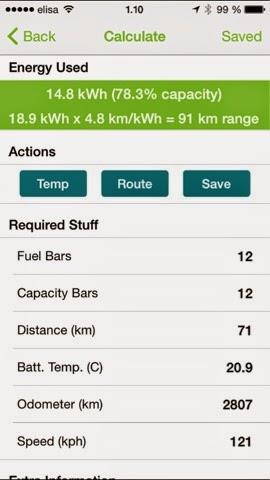 Minusta laskuri antoi aika uskottavan oloisen tuloksen. Käyttäen nopeutta 120km/h, selkeän kesäkelin sattuessa toimintasäteeksi täydellä lähtölatauksella muodostuisi noin 91km, joka riittäisi tuolle reitille. Aika näyttää, pitääkö tuo paikkaansa.