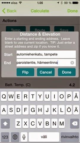 Reitin haun jälkeen appsi kertoo matkan, ja jopa alku ja lähtöpisteiden korkeudetkin.