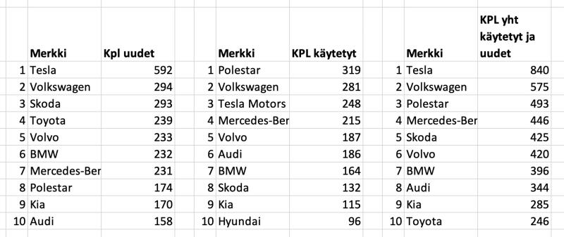 Tesla oli maaliskuussa 2026 ylivoimaisesti eniten rekisteröity sähköhenkilöautot Suomessa (uudet + käytetyt) 840 autollaan. Samalla se oli myös uusissa henkilöutoissa sähköautojen ykkkönen. Käytetyissä ykkönen oli Polestar.