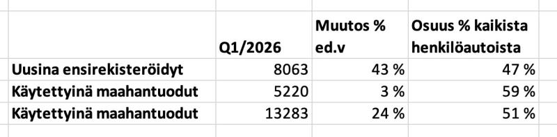 Vuoden 2026 ensimmäisellä kvartaalilla sähköhenkilöautojen osuus (uudet + käytetyt) kaikista henkilöautojen rekisteröinneistä oli myös yli puolet, eli 51 %. Kvartaalilla rekisteröitiin Suomeenyhteensä 13 283 sähköhenkilöautoa, joista 8063 kpl oli uusina ensirekisteröityjä ja 5220 kpl oli käytettyinä maahantuotujen rekisteröintejä.