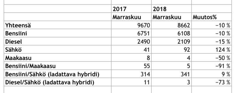 Marraskuussa 2018 sähköautoja ensirekisteröitiin yli kaksinkertainen määrä viime vuoteen nähden