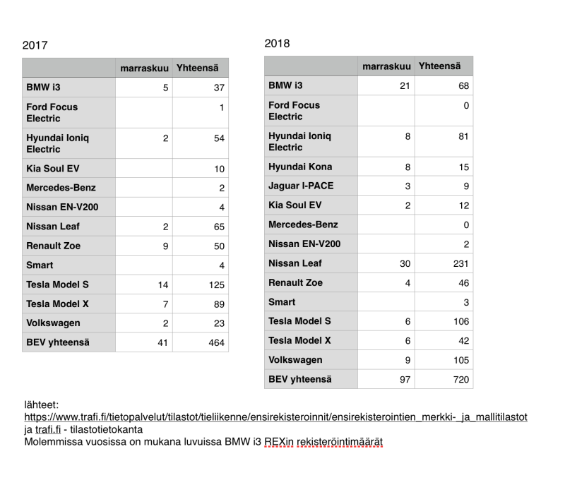 Marraskuun ensirekiseröinnit olivat 97 kappaletta, joka on yli kaksinkertainen määrä viime vuoden marrraskuuhun verrattaessa. Marraskuussakin kärkeä piti Leaf 30 kappaleella, mutta i3 kiri yllättävän korkealle päätyen 21 kappaleeseen. Minun tilastoissani olen aina ottanut i3 REXit mukaan sähköautoihin ja niitä oli vielä näistä viisi kappaletta. Ymmärtääkseni 120Ah-versiosta ei enää ole tulossa REXiä lainkaan, joka on harmi.