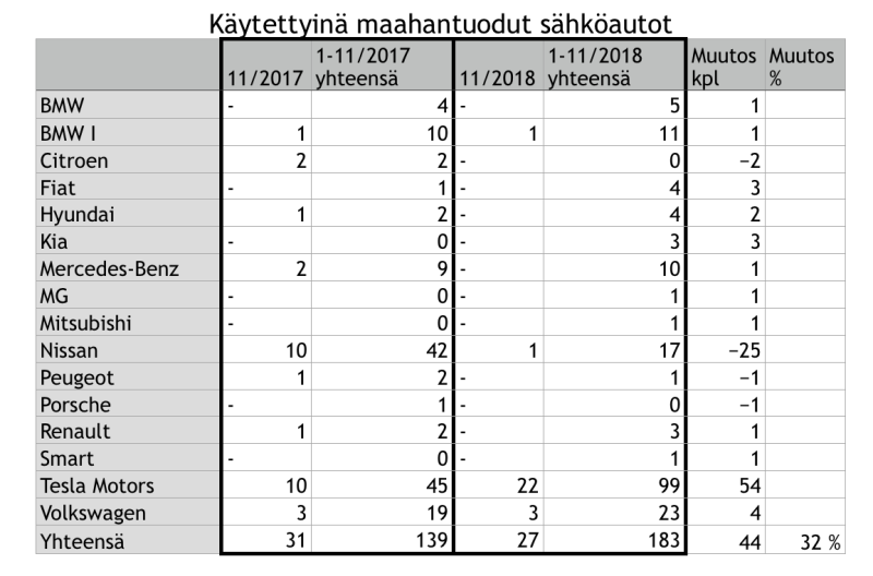 Käytettyinä tuotiin marraskuussa maahan yhteensä 27 sähköautoa ja koko alkuvuoden aikana on tuotu yhteensä 183 sähköautoa käytettyinä maahan. Tesla on noussut odotusteni mukaisesti käytettyinä tuoduissa ylivoimaisesti suosituimmaksi sähköautoksi ja niitä onkin tuotu tammi-marraskuussa yhteensä 99 kappaletta. Näissä käytetyissä sähköautoissa ei Trafilla rekisteröidy BMW i3:sten REX-mallit mukaan ja i3:sista suurin osa on ollut niitä.